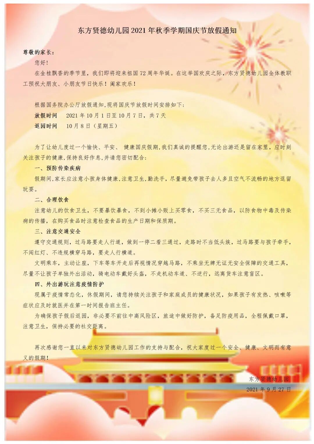 “家”是最小国,“国”是千万家。在一片祥和中,我们迎来了伟大祖国的72岁生日。 72年风雨兼程,我们的祖国欣欣向荣、蒸蒸日上,我们的民族扬眉吐气、自信满怀,我们的人民幸福安康、意气风发! 何其有幸,生在红旗下,长在春风里。 人民有信仰,国家有力量,民族有希望。 愿山河无恙,祝祖国繁荣昌盛! 有了强的国,才有富的家,家是最小的国,国是千万家,我爱我的国,我爱我的家。 国庆节的由来 中华人民共和国国庆节又称十一、国庆节、国庆日、中国国庆节、国庆黄金周。中央人民政府宣布自1950年起,以每年的10月1日,为中华人民共和国宣告成立的日子,即国庆日。 国庆节意义 国庆纪念日是近代民族国家的一种特征,是伴随着近代民族国家的出现而出现的,并且变得尤为重要。它成为一个独立国家的标志,反映这个国家的国体和政体。 国庆这种特殊纪念方式一旦成为新的、全民性的节日形式,便承载了反映这个国家、民族的凝聚力的功能。同时国庆日上的大规模庆典活动,也是政府动员与号召力的具体体现。 显示力量、增强国民信心,体现凝聚力,发挥号召力,即为国庆庆典的三个基本特征。 中国国旗 国旗是国家的一种标志性旗帜,是国家的象征,它通过一定的样式、色彩和图案反映一个国家政治特色和历史文化传统。在一个主权国家领土上一般不得随意悬挂他国国旗。世界上各国国旗的颜色主要有红、白、绿、蓝、黄、黑等,这些颜色各有一定的含义,形状绝大多数是长方形。 中华人民共和国国旗的红色象征革命。旗上的五颗五角星及其相互关系象征共产党领导下的革命人民大团结。五角星用黄色是为了在红地上显出光明,四颗小五角星各有一尖正对着大星的中心点,表示围绕着一个中心而团结 中国国歌 国歌,是代表一个国家民族精神的歌曲,是被国家的政府和人民认为能代表该国家政府和人民意志的乐曲。一般来说它们都带有爱国主义色彩。中华人民共和国国歌是由田汉作词、聂耳作曲的《义勇军进行曲》,被称为中国民族解放的号角,自1935年在民族危亡的关头诞生以来,在人民中广为流传,对激励中国人民的爱国主义精神起了巨大的作用。1949年中国人民政治协商会议决定把这首歌作为代国歌,体现了中国人民的革命传统和居安思危的思想。 中国国庆阅兵 天安门,阅兵仪式会场,坐落在中华人民共和国首都北京市的中心,故宫的南端,与天安门广场以及人民英雄纪念碑,毛主席纪念堂,人民大会堂,中国国家博物馆隔长安街相望,占地面积4800平方米,以杰出的建筑艺术和特殊的政治地位为世人所瞩目。 如何能让孩子度过一个快乐,安全,有意义的国庆节? 1.幼儿与父母可以在家选择一部不错的抗战影片,让孩子直观,形象地了解抗日战争时期的历史。 2.有条件可走进纪念馆,在真实体验中,进一步提升孩子爱国热情。 3.与父母一起进行一场红色经典传唱或者朗诵活动。 4.亲子时刻:与父母共同制作一幅手工作品。 5.最后,肯定不能落下十月一日的阅兵仪式。 让爱国、爱家的种子植根于幼儿们的心中。热爱祖国、热爱家乡,从小做起,从我做起! 【东方贤德幼儿园2021年秋季学期国庆节放假通知】 为做好国庆期间疫情防控工作,接上级通知要求,请各位家长尽量留深过节,确有必要离深的,请在班级群报告离深所前往地区(严禁前往中高风险区),返深后48小时内完成核酸检测,并将检测结果发给主班老师。国庆期间身体出现异常的幼儿(发热、发烧等)请及时告诉主班老师。 祝大家度过一个安全、健康而有意义的假期。 东方贤德幼儿园 园风:依于仁 敏于行 博于艺 教风:率人性 化人文 做人师 地图导航:东方贤德幼儿园 联系电话:0755-29123009 深圳市宝安区松岗街道松裕路2号
