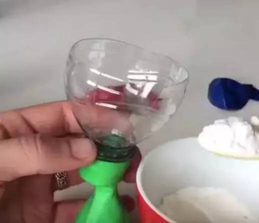 第一步:将一勺小苏打放进气球内;(将水瓶瓶口剪出来可以当做漏斗,套进气球里,能让小苏打更容易装进气球)
