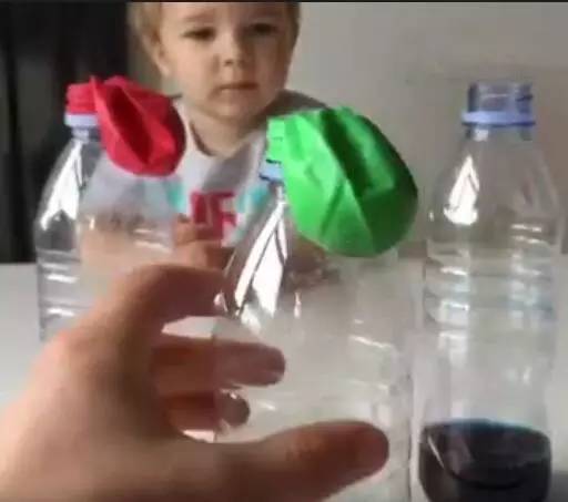 第四步:让孩子把气球提起来,小苏打掉落进瓶子里,彩色的泡沫立马升起来,气球也就膨胀啦