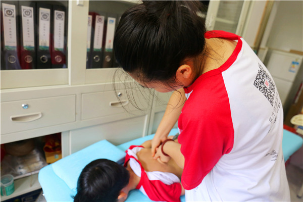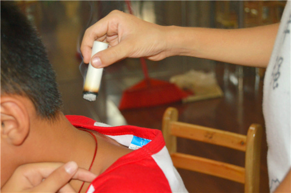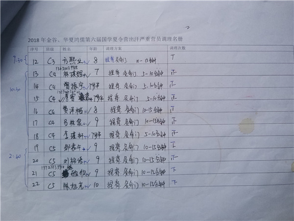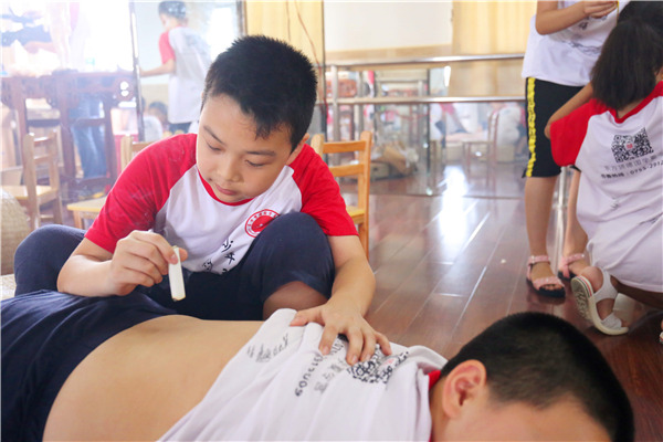 每周七个班的孩子轮流作捏脊背,艾灸保健。有小小问题,及时解决。目前所有夏令营孩子都健健康康。