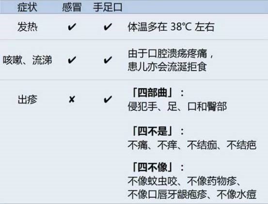 手足口病是一种儿童传染病,发病多,重症险,被感染后不会马上出现症状,多会潜伏体内2-7天后突然发病。手足口病初期症状与感冒非常像,一般也会有发热、咳嗽、流涕、打喷嚏等症状,多数患儿体温会在 38 ℃ 左右,且由于口腔溃疡,患儿会出现流口水、拒绝进食的情况。手足口病最大的特点是,宝宝还会出疹子,而感冒并不会。它引起的疹子是一种透明的水疱,主要集中在手、脚、口腔和肛门周围,疹子不痛、不痒、不结痂、不结疤。