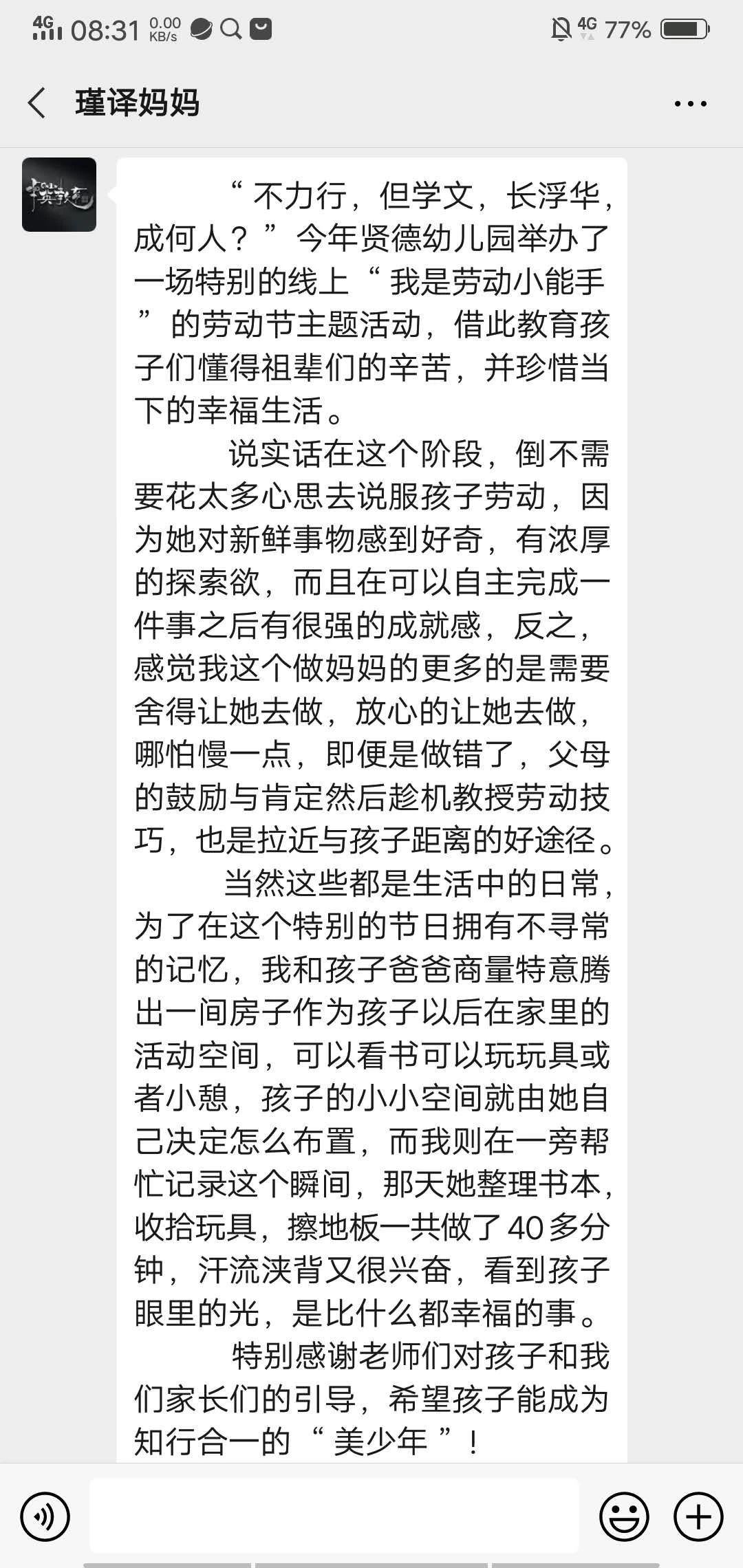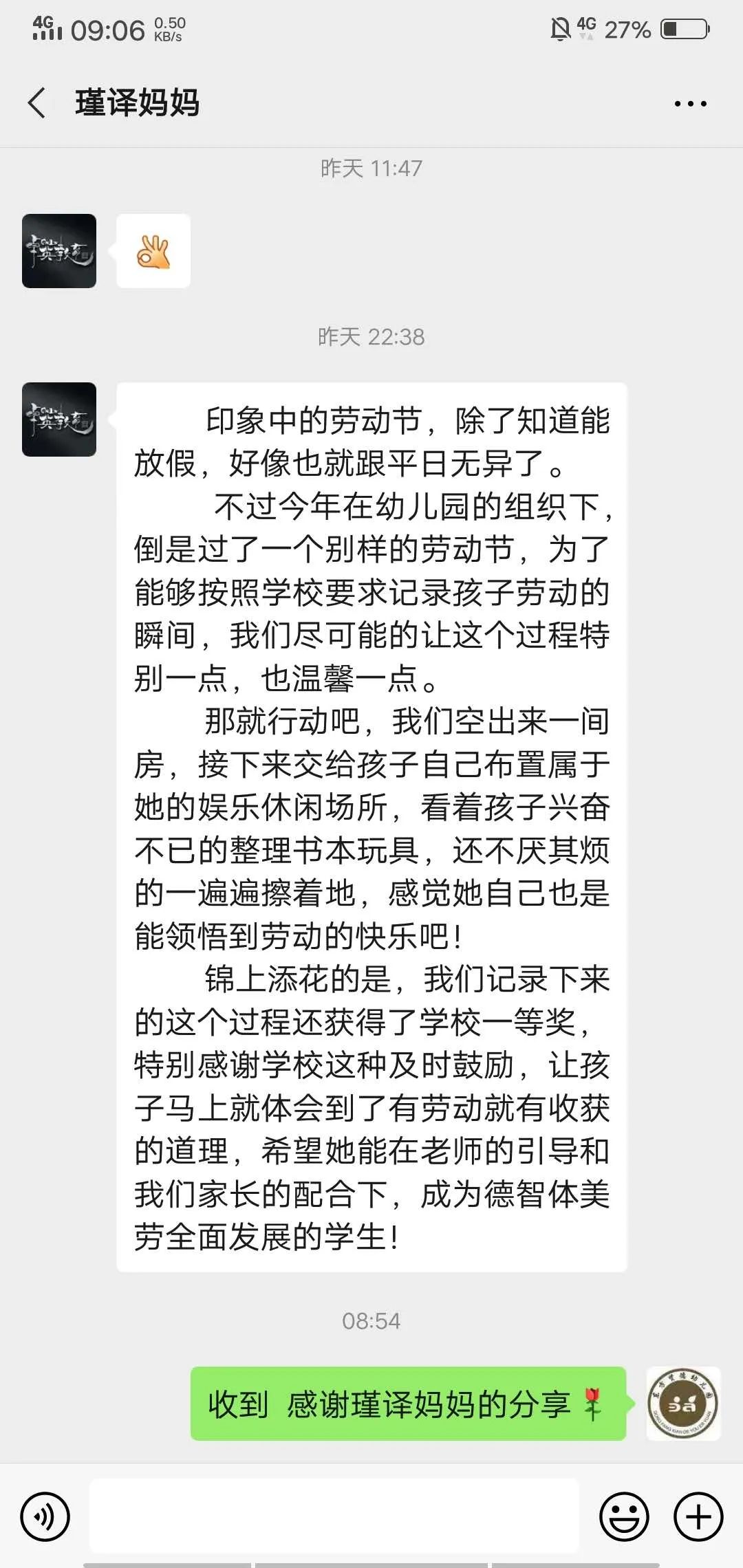 恰逢“五一”国际劳动节,我们利用一年一度的劳动教育的最佳机会,发起“我是劳动小能手”的活动,让孩子们在家长的陪伴引导下,积极的进行劳动体验和劳动教育!很多我们园内小朋友和贤德社区读书会的小朋友都积极踊跃的参加,在劳动节帮助父母分担家务,力行习劳,自己的事情自己做,做到知行合一,懂得感恩,体会到父母的辛苦和不易。每位参加本次活动的宝贝都非常棒!