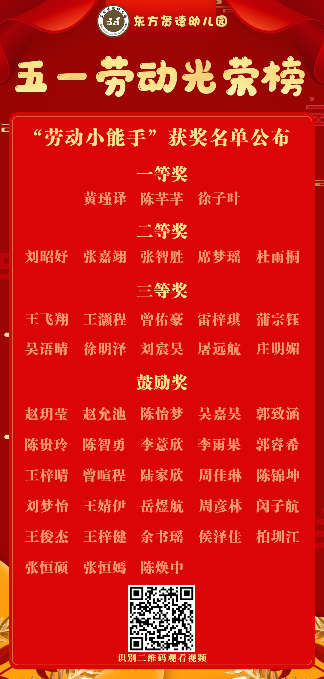 活动开展后老师们收集了参加本次活动的宝贝们的劳动视频,经过评委老师们的认真评选,从劳动视频的整体效果、劳动内容的丰富程度、视频中孩子的语言表达、家长的积极引导与配合等方面进行了反复甄选,最终评出了“五一”劳动节“我是劳动小能手”一等奖、二等奖、三等奖、鼓励奖,一起看看本次活动的劳动光荣榜吧!