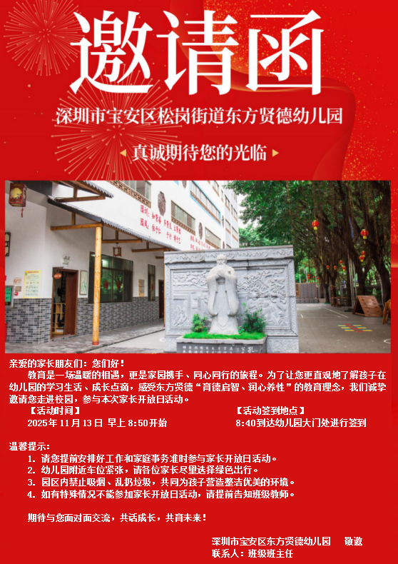 同时,诚挚邀您积极邀请身边有适龄宝贝的亲戚、朋友一同前来! 让我们以文化为桥,汇集更多重视传统教育的家庭,既能让亲友实地考察幼儿园的文化氛围与教育实力,为他们选择优质幼儿园提供真实参考,也能让更多家庭加入贤德共育的大家庭,携手传承中华文脉,助力宝贝们在传统文化滋养下茁壮成长!